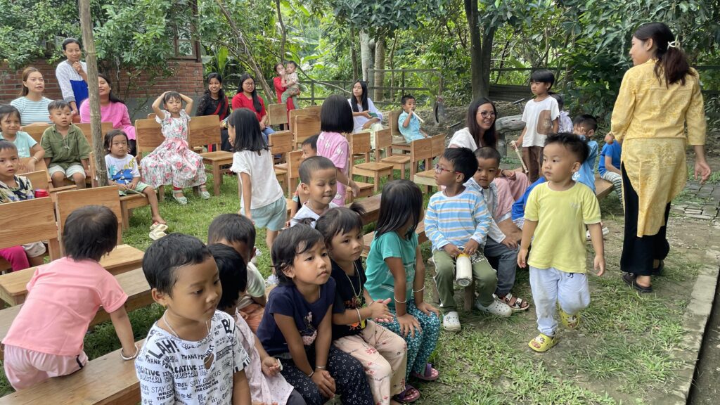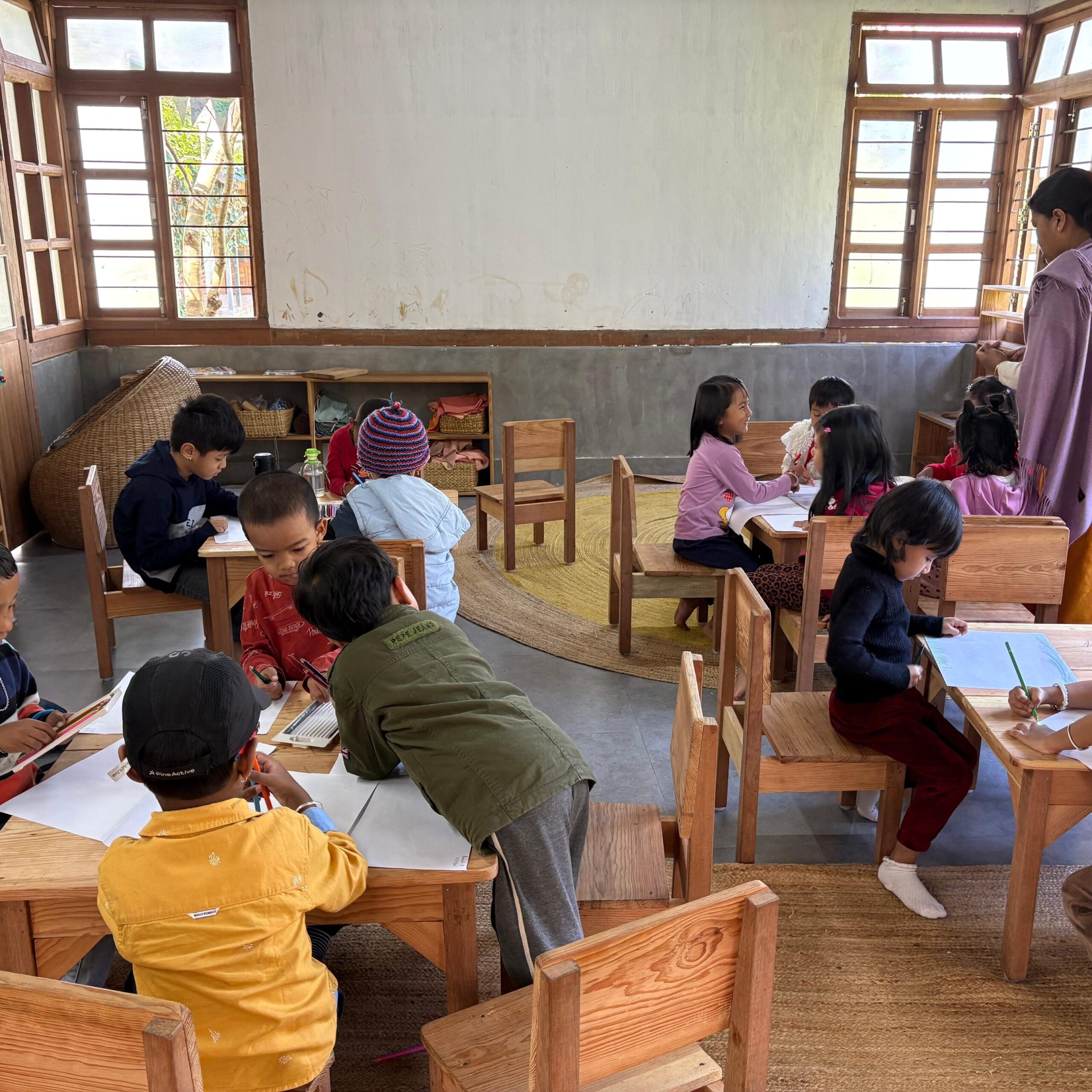 Many activities take place in our lawn and gardens among trees, vegetables, water and earth. Such environment fully engages the senses and allows for adaptability, and opportunity to take risks. Children also go on regular nature walks along the magnificent water bodies of Luwangsangbam, beside Matai hills, in paddy fields, and many other inspiring sites in Matai village. Such opportunities help children realise their oneness with nature and hone their observation skills as well.