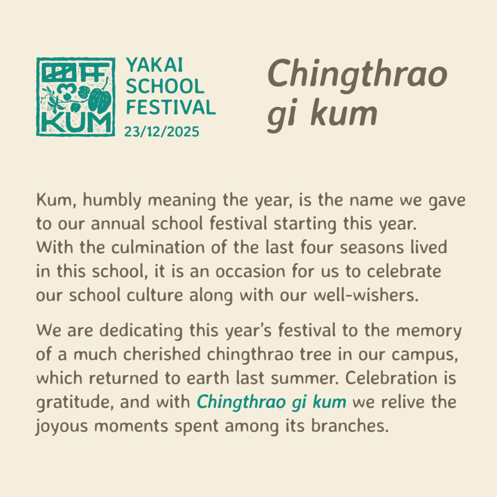 Kum, humbly meaning the year, is the name we gave to our annual school festival starting this year. With the culmination of the last four seasons lived in this school, it is an occasion for us to celebrate our school culture along with our well-wishers. We are dedicating this year’s festival to the memory of a much cherished chingthrao tree in our campus, which returned to earth last summer. Celebration is gratitude, and with Chingthrao gi kum we relive the joyous moments spent among its branches.